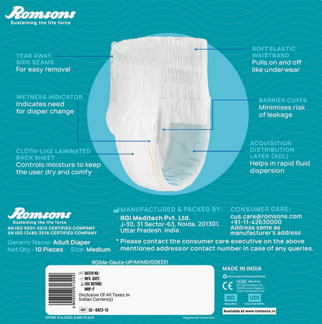 ✅ Barrières anti-fuites avec élastiques aux jambes – Assurent une protection renforcée contre les fuites urinaires et fécales.